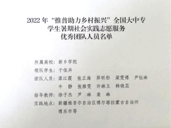 近日,教育部、共青团中央对2022年“推普助力乡村振兴”全国大中专学生暑期社会实践志愿服务活动进行表彰,新乡学院实践团队“‘同语同心一家亲’新疆籍大学生返家乡推普实践团”获评全国优秀团队,团队师生受到了教育部语言文字应用管理司、共青团中央青年发展部致信表扬。