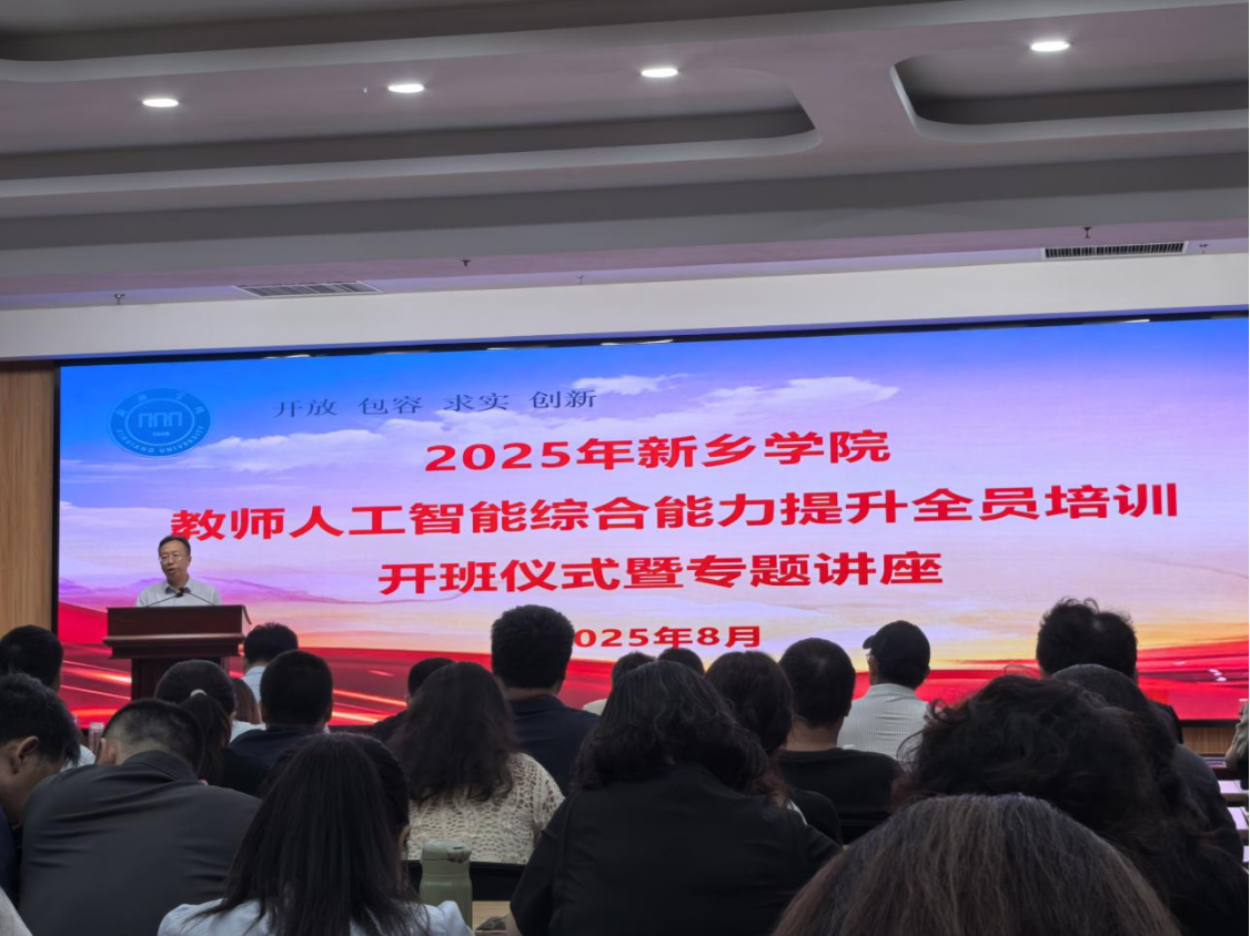 为深入贯彻习近平总书记关于人工智能的重要论述,强力实施国家教育数字化战略,全面落实《河南省“人工智能+教育”三年行动计划(2025-2027)》,根据河南省教育厅相关文件要求,全面提升全校教师人工智能应用能力与教育教学创新水平,新乡学院于8月25日上午在图书馆一楼东报告厅隆重举行“教师人工智能综合能力提升全员培训”开班仪式暨专题讲座,开班仪式由新乡学院副校长张银堂主持。