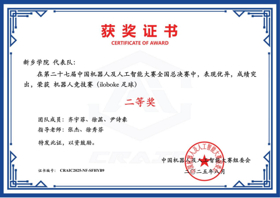 在为期三天的足球机器人3V3激烈角逐中,由周宁和马超两位老师指导的“我说的都”队(周永、于帅旗、张彪三名同学),先后战胜哈尔滨工业大学(深圳)、上海大学、武汉科技大学等多所强校对手,以全胜战绩取得全国一等奖。张杰、徐秀芬老师指导的“Book思议”队(齐宇菲、徐菡、尹诗豪三名同学)获得全国二等奖。比赛中,队员们沉着自信,根据对手战术和赛场实际情况,利用比赛间隙快速拆换调试机器人零部件、修改比赛代码和优化比赛策略,这份荣誉不仅是指导老师和参赛同学长期努力钻研、反复强化训练、辛苦付出的成果,更是综合实践能力的体现!