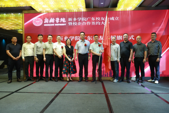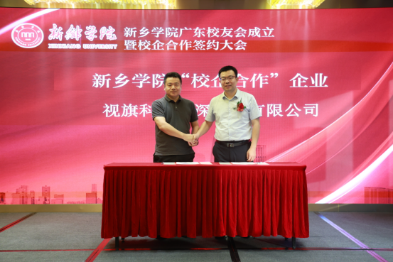 大会严格遵循民主议事程序,表决通过《新乡学院广东校友会章程》,并选举产生第一届理事会成员:曾帅当选会长,程松阳、赵俊杰、罗亚华、方万军、李景涛、肖飞、张建当选副会长,朱普森当选秘书长,秦豪、张江伟、段新桂、柴君莹当选副秘书长。会上,时红霞代表学校校友会宣读《关于同意成立新乡学院广东校友会的决定》,明确了校友会的合法定位及未来发展方向;陈磊山先后为新当选的理事会成员颁发聘书,并郑重授予广东校友会会旗,标志着新乡学院广东校友会组织架构正式搭建完成。首任会长曾帅在表态发言中表示,广东校友会将建立广泛高效的联络渠道,着力打造覆盖全面、运行高效的组织体系;常态化组织各类校友活动,促进校友在事业发展与生活交流中的深度合作,实现共同成长;聚焦校友核心需求,积极提供力所能及的支持与帮助,成为校友信赖的坚实后盾;搭建母校与校友、校友与校友之间的合作桥梁,凝聚校友智慧与力量,为母校建设发展添砖加瓦。新乡学院南阳校友会会长刘新旺宣读贺信,代表南阳、浙江、新乡校友会对广东校友会的成立致以衷心祝贺。广东省业内知名企业及优秀校友企业深圳市航顺芯片技术研发有限公司、视旗科技(深圳)有限公司,与学校正式签订校企合作框架协议,就深化产教融合、推进协同发展达成初步合作意向。