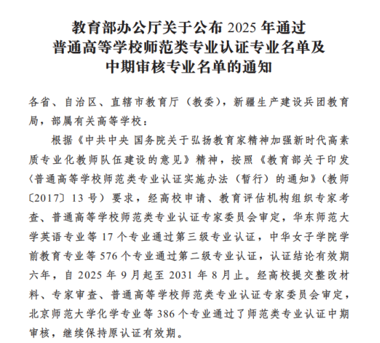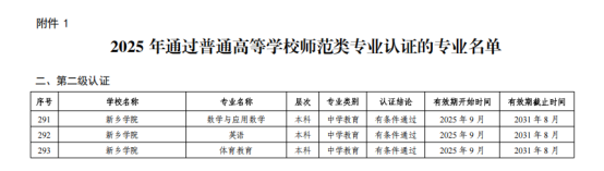 近日,教育部办公厅发布了《关于公布2025年通过普通高等学校师范类专业认证专业名单及中期审核专业名单的通知》(教师厅函〔2025〕18号),我校数学与应用数学、体育教育和英语专业顺利通过教育部师范类专业第二级认证,认证结论有效期六年。