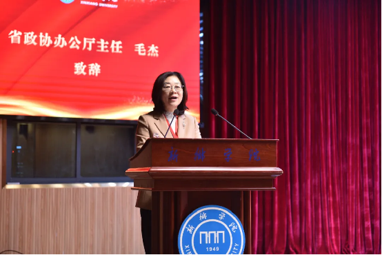毛杰代表河南省政协致辞。她指出,高镇五先生不仅是河南省教育史上的丰碑式人物,也是我省政协系统的骄傲。他的精神跨越时空,在今天依然具有强大的感召力。她强调,深入开展“高镇五教育家精神”研究,既是对新乡学院校史、河南政协历史的珍视,更是对时代使命的积极回应。毛杰表示,河南省政协将一如既往关注并支持相关研究工作,积极搭建交流平台,推动研究成果转化应用,让高镇五教育家精神在新时代绽放更璀璨的光芒,为河南教育事业繁荣发展添砖加瓦。