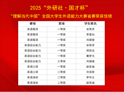 此次优异成绩是我校人才培养成果的一次生动展现,充分体现了学校在培养具备家国情怀、全球视野、扎实外语能力与跨文化沟通素养的高素质人才方面取得的显著成效。外国语学院将以此为契机,持续深化教育教学改革,不断优化教学方法,着力培养更多具备国际视野与竞争力的复合型外语人才,为我国外语教育事业的蓬勃发展贡献更大力量。