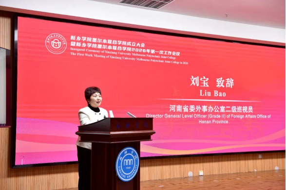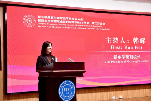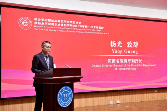 3月16日,新乡学院墨尔本联合学院成立大会暨2026年第一次工作会议在图书馆一楼东报告厅召开。澳大利亚驻华大使馆商务参赞白亚宁(Iannis Patin)、商务处商务官员刘熹璇(Grace Liu),墨尔本理工学院副校长提姆・吉尔伯特(Timothy Gilbert),澳大利亚职业教育联盟秘书长关北松(Barry Guan);河南省教育厅副厅长杨光,河南省委外事办二级巡视员刘宝,新乡市人民政府副市长刘兵等省、市相关部门领导;新乡学院党委书记王孝俊,校长李广慧等校领导班子成员,学校职能部门、二级学院负责人及师生代表出席会议。大会由副校长韩辉主持。