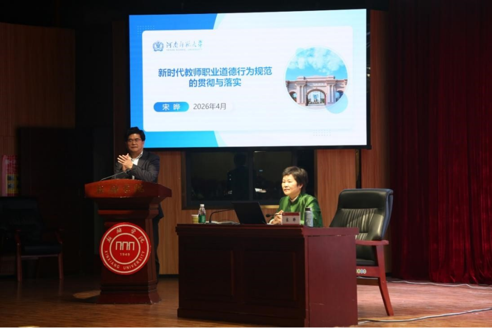 河南师范大学副校长宋晔教授应邀作题为《新时代教师职业道德行为规范的贯彻与落实》专题报告。宋晔从理论渊源、政策背景、总体要求、正面准则、违规处理五大维度,系统阐释了新时代教师职业行为规范的核心要义,深度梳理了师德建设从古代德性伦理、近代专业伦理到当代制度伦理的演进脉络,鲜明指出师德建设在教育强国、教育强省战略中的基础性、先导性地位。她强调,落实教师职业行为规范,既是促进教师专业成长、提升育人质量、保障师生权益的必然要求,也是严守行为底线、树立师德高线的双重实践。报告结合典型案例,立足高等教育与基础教育双视角,精准解读《新时代教师职业行为十项准则》,为广大教师在坚定政治方向、自觉爱国守法、传播优秀文化等方面划定清晰行为标尺。