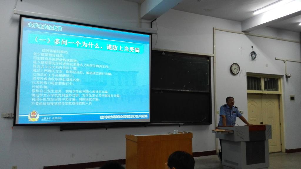 9月12日、13日,学校聘请新乡市公安局洪门分局8名干警,在A-01号教学楼7个多媒体教室,对18个院系的本、专科新生进行了危险及安全教育讲座。