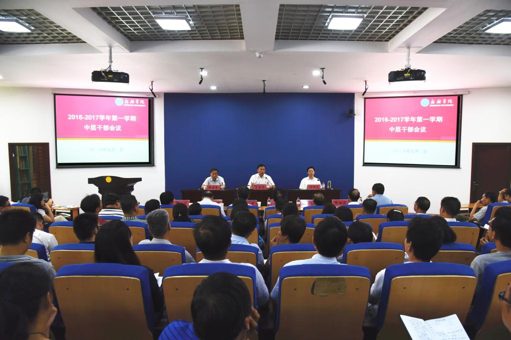 接着,党委书记丁庭选就新学期的工作对全体中层干部提出了六点要求:一是要讲规矩,深入推进“两学一做”学习教育。不仅要带头讲规矩、以上率下,更要发挥制度效力,把规矩意识融入强管理、带队伍、正风气、干事业的实践中去;二是要守纪律,深入推进党风廉政建设和反腐败工作。要认真学习“一准则两条例”,严格遵守政治纪律、组织纪律、廉洁纪律、群众纪律、工作纪律和生活纪律;三是要明方向,深入推进学校转型发展。要真正做到“两个主动”“四个转到”“两个提高”。即:主动适应经济发展新常态、主动融入产业转型升级和创新驱动发展,把办学思路真正转到服务地方经济社会发展上来,转到产教融合校企合作上来,转到培养应用型技术技能型人才上来,转到增强学生就业创业能力上来,全面提高学校服务区域经济社会发展和全面提高创新驱动发展的能力;四是要强能力,深入推进干部队伍建设。加强领导班子的七种能力建设,建设一支能征善战的干部队伍;五是要勇担当,深入推进学校综合改革。面对难题,要勇于负责、敢于负责。面对新形势,敢于从改革上找出路,创造性地开展工作;六是要重落实,深入推进巡视整改工作。要充分认识和理解巡视工作的重要意义。针对巡视组提出的问题,结合具体情况,制定学校整改方案,将问题整改落实到位。