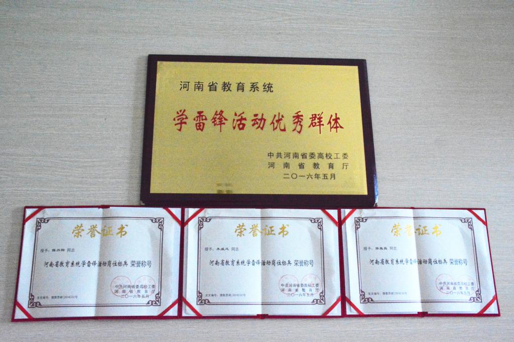 在中共河南省委高校工委、河南省教育厅联合组织的关于开展学雷锋活动先进集体和先进个人评选工作中,我校青年志愿者联合会“爱·手语”服务队获得“河南省教育系统学雷锋活动优秀群体”荣誉称号,朱威风、陈真真、陈丹阳同学分别获得“河南省教育系统学雷锋活动岗位标兵”荣誉称号。
