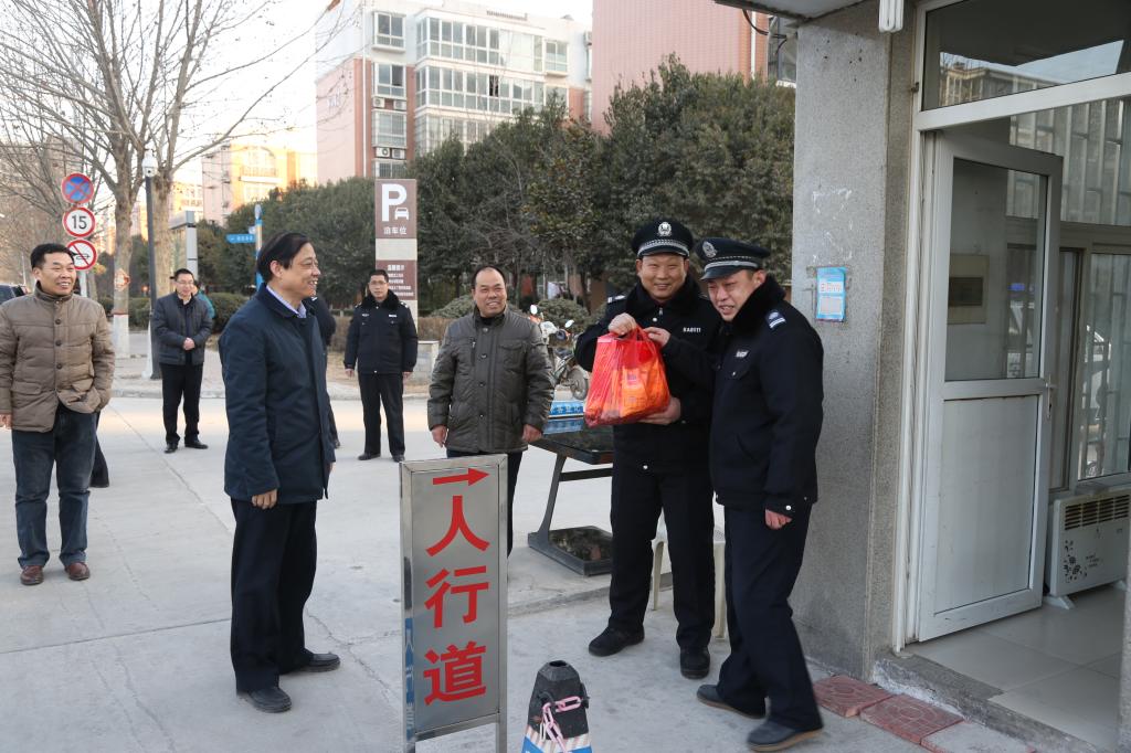 刘校长一行先后到学校行政楼、动力中心、南大门、学生公寓、教学楼、北大门、警务室、东大门、校医院等地,亲切看望了保卫、后勤寒假值班人员和留校学生,并送上了慰问品。同时,他查看了校园视频监控系统、锅炉供暖和水电管理场所的运行情况。他希望一线值班人员要牢固树立责任意识,确保学校各项工作安全、有序。