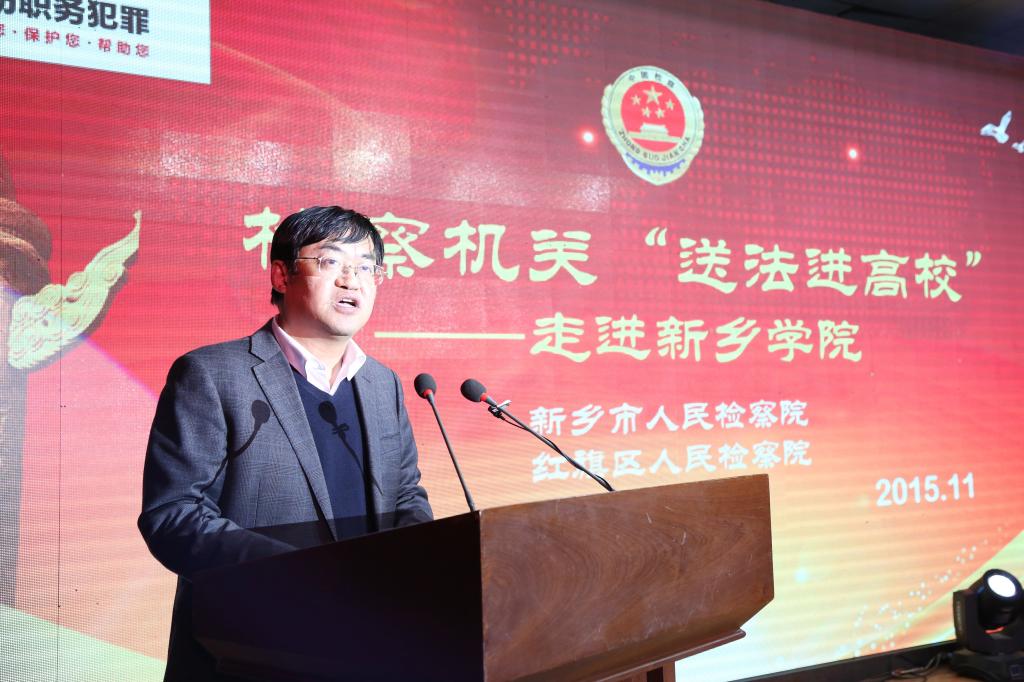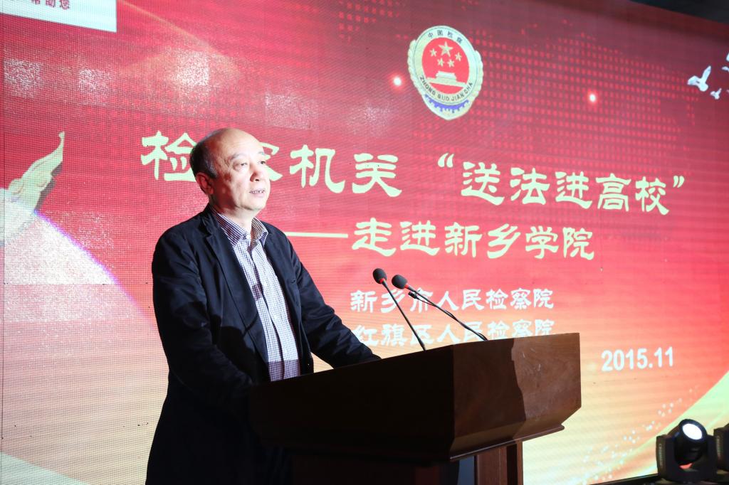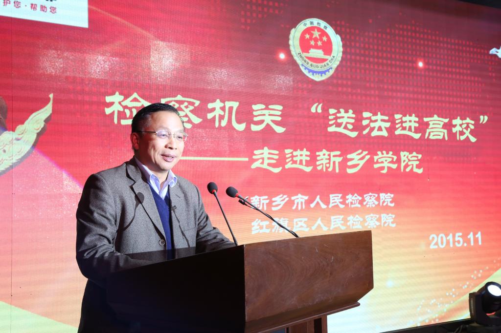 日下午,由新乡市检察院、红旗区检察院联合主办的检察机关“送法进高校”专项活动在我校A-01号楼报告厅举行。党委书记丁庭选,校长刘兴友,党委副书记陈贞忠,党委副书记、工会主席阎宏斌,副校长吴中、刘翔、王选年、杨士斌、陈业宏,纪委书记贺杰,新乡市检察院党组书记、检察长许晓伟,红旗区人民政府区长郑援越,新乡市检察院职务犯罪预防局局长高遂林,红旗区检察院党组书记、检察长刘鹰,驻新高校纪委书记、监察处长及我校中层干部出席此次活动。