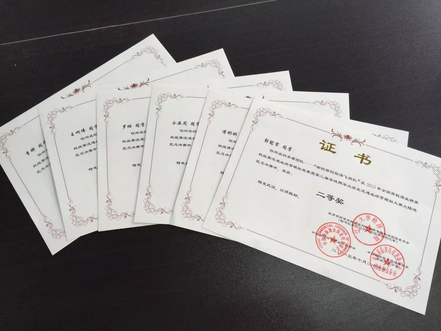 2015年10月21日至25日,由教育部高校经济与贸易类专业教学指导委员会主办的2015年全国高校商业精英挑战赛流通业经营模拟竞赛大陆地区决赛在全国多所高校全面开展。决赛分为四个周期,每天提交一个周期的决策到服务器,最后以四个季度结束后的EVA值作为比赛结果进行评比,我校管理学院以郭冠宋同学为总经理的“新院管院物语飞扬队”荣获二等奖.