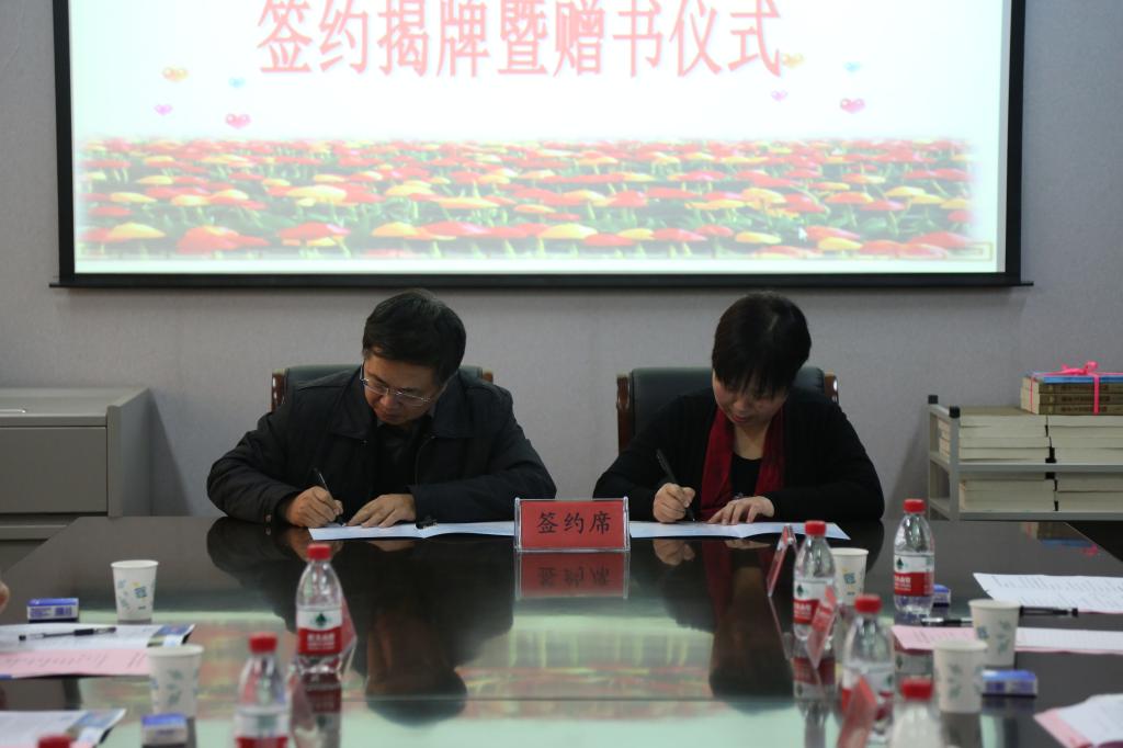民进新乡市委副主委戴宪起与文学院院长袁蕾代表双方签署《新乡学院协同创新实习实训基地协议》,揭牌并合影留念。