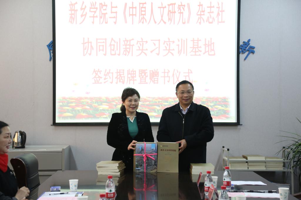 李瑞霞副市长代表《中原人文研究》杂志社向新乡学院赠送杂志出版的刊物,校党委书记丁庭选代表新乡学院接受了赠书。双方代表合影留念。