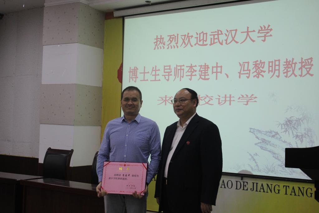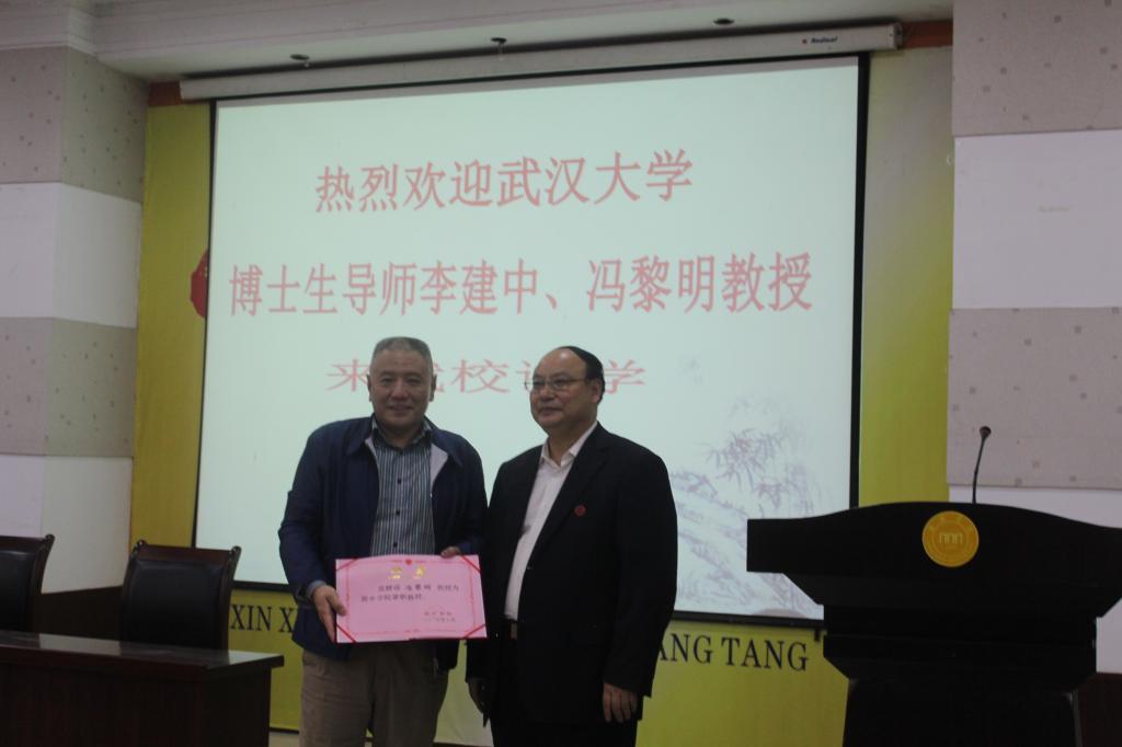 10月16日下午,应我校文学院邀请,武汉大学博士生导师李建中教授与博士生导师冯黎明教授来我校讲学。李建中教授是文艺学和中国文学批评史专业博士生及博士后导师、中国文心雕龙学会副会长、中国古代文学理论学会常务理事、中国文学批评史专业学术带头人,国家社科基金重大攻关项目主持人,主要从事中国文论与文化的研究与教学。冯黎明教授为武汉大学博士生导师,主要研究方向为文学理论与现代思想文化史。出版《当代西方文艺批评主潮》等多部学术著作,发表学术论文与评论一百余篇,主持多项国家、教育部、文联部级等多项研究项目,并多次荣获优秀成果奖项。讲座开始前,我校副校长杨士斌分别向李教授和冯教授颁发了我校特聘教授证书。