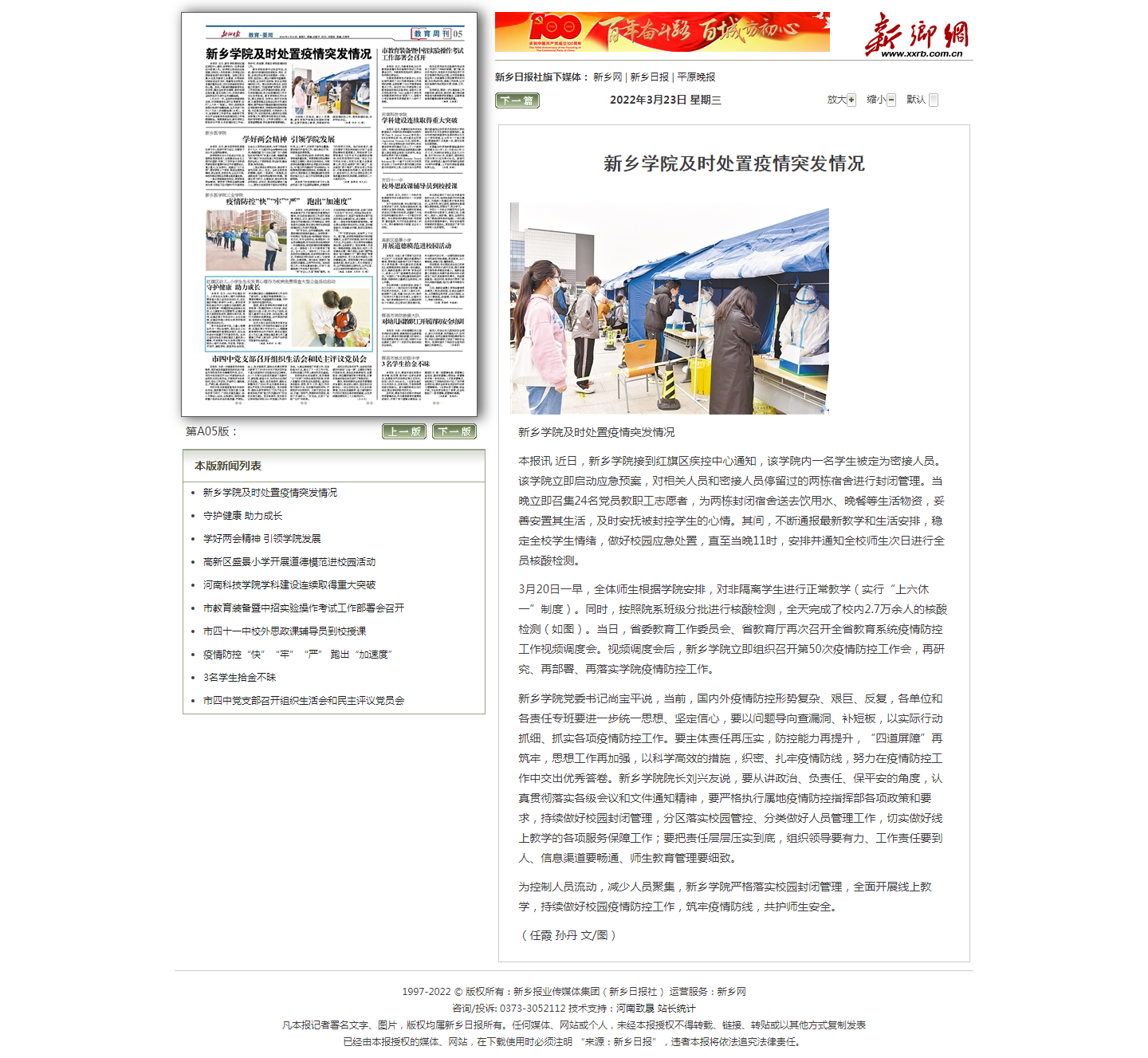 3月23日,新乡日报5版以《新乡学院及时处置疫情突发情况》为题,报道我校近期疫情防控工作。