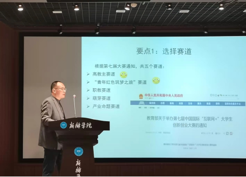苏武江结合“互联网+”大学生创新创业大赛快速入门方面的内容,讲解了大赛的具体流程,基本要求,主要目的,以及往年优秀作品展示,并鼓励引导学生积极组建团队,设计创新创业项目,选择适合的赛道参赛。