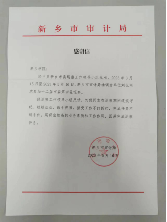 在这次专项工作中,刘侃老师以较高的专业素养,带着学校的期望,利用财务审计专业经验和优势圆满完成了任务。工作中的刘侃老师积极主动、认真负责,不仅深刻学习领悟巡察工作实质要义,更是精准把握党中央部署开展工作。新乡市委巡察工作领导小组对刘侃老师的工作给予了充分肯定,新乡市审计局还专门给我校写来表扬信,为刘侃老师的专业素养和我校服务地方所做的贡献提出了表扬。
