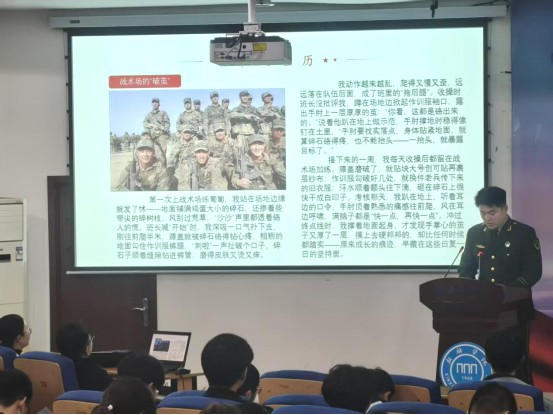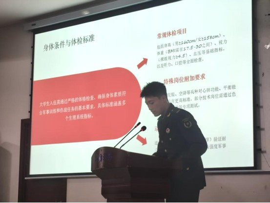 宣讲会上,播放了征兵主题短片《逐梦军营》,全景展现新时代革命军人昂扬风貌。在退役学子事迹分享环节,3名退役大学生士兵依次登台:张铭心(陆军某部,服役5年,获评“四有”优秀士兵1次,曾荣获特种兵集训比武第1名),围绕“从新兵到骨干的进阶之路”,回顾高原驻训、带兵新训的淬炼历程;李金龙(武警第二机动总队某支队,服役2年,获评“四有”优秀士兵1次),分享比武夺魁、抢险救援的难忘经历;祁习翔(中央军委办公厅警卫勤务大队,服役2年,获嘉奖2次),讲述在天安门广场执行警卫任务的光荣与使命。鲜活的事迹、真挚的情感引发师生阵阵掌声。
