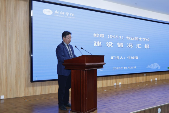 教育科学学院院长牛长海教授代表教育硕士学位点建设团队进行建设情况汇报,汇报按学科方向进行,包括建设现状、存在差距和改进措施。