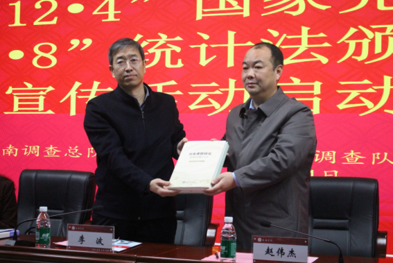 启动仪式上,赵伟杰首先致欢迎辞,对河南总队一行表示热烈欢迎,并介绍学院在法治教育、统计学科建设方面的成果。随后,李波作动员讲话。李波指出,宪法是国家的根本大法,是治国安邦的总章程,而《中华人民共和国统计法》则是宪法精神在统计领域的具体体现,是确保数据真实、准确、完整的法治基石。他强调,国家调查队承担着居民收支、粮食产量、就业物价等一系列关乎国计民生的重要调查任务,必须始终坚持依法统计、依法治统,坚决维护统计数据的权威性和公信力。他鼓励广大师生积极学习法律知识,培育法治思维,将尊法、学法、守法、用法融入日常学习与生活,共同营造崇尚法治、遵守规则、敬畏数据的校园文化与社会风尚。动员讲话后,李波向新乡学院赠送了统计法及法治宣传相关书籍,为青年学子播下法治的种子。随后,柴昀简要介绍了新乡国家调查队的主要职能与工作概况。