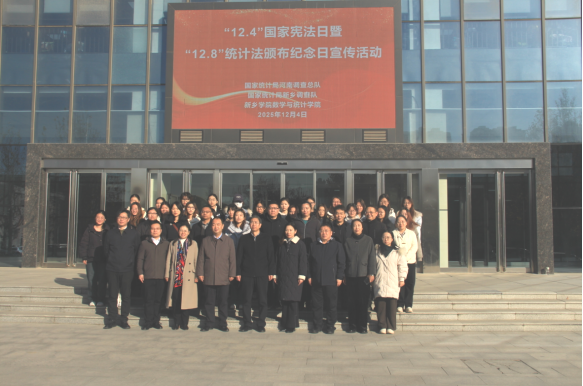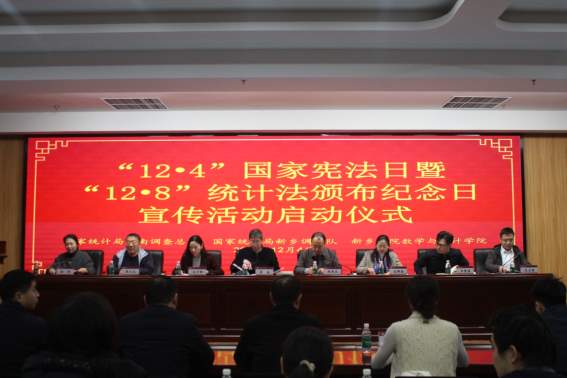 2025年是我国统计“八五”普法规划的收官之年,为深入贯彻落实党的二十大和二十届历次全会精神,深学笃行习近平法治思想,进一步强化法治意识、加强新修改统计法的学习宣传贯彻,12月4日,由国家统计局河南调查总队主办,国家统计局新乡调查队和新乡学院数学与统计学院、法制办承办的“12·4”国家宪法日暨“12·8”统计法颁布纪念日宣传活动在新乡学院成功举办。国家统计局河南调查总队党组成员、副总队长李波,新乡学院副校长赵伟杰,新乡队党组书记、队长柴昀,新乡学院法制办主任王智博,数学与统计学院党委书记毛群英、院长张之正等领导出席了启动仪式。总队执法监督处、新乡国家调查队系统和新乡学院师生代表约200人参加了本次活动。