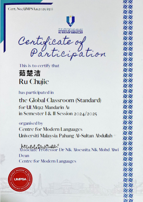 2025年8月17日,“全球高阶课堂”Semester 2 session 2024/2025正式结束,双方在线上进行了结业仪式。马来西亚彭亨大学现代语言中心江美芬老师主持结业典礼,同时高度评价了参与项目的学生,认为新乡学院人文学院学生专业基础知识深厚,双语教学功底扎实,能够积极创新教学方法,将汉语教学与剪纸、茶艺等中国传统文化相结合,采用趣味互动训练发音,使语言学习与体验紧密结合,进一步增强了课堂吸引力,有效降低了彭亨大学学生的学习焦虑,同时还能及时灵活处理线上教学的临时突发问题,体现了较强的临场应变能力和课堂组织能力,表现出高素质国际汉语教师的综合水平。