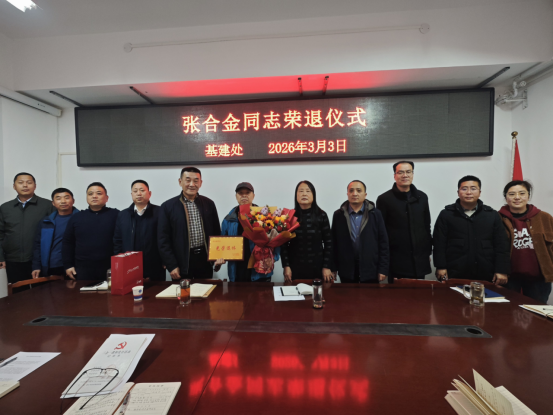 3月3日下午,基建处在会议室为张合金同志举办了一场温馨而庄重的荣退欢送会。基建处全体人员欢聚一堂,用一场温暖而庄重的仪式,向数十载默默奉献的教职工致以最崇高的敬意与最真挚的祝福。欢送仪式由党支部书记郭兵主持。