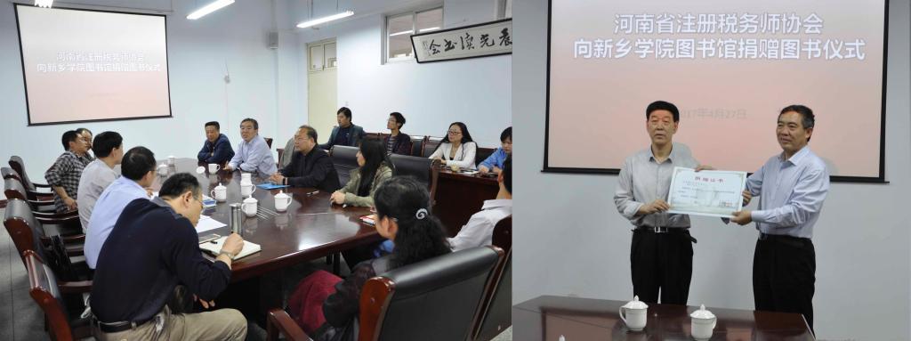 4月27日下午,河南省注册税务师协会图书捐赠仪式在我校图书馆二楼会议室隆重举行。副校长张占祯代表我校对河南省注册税务师协会会长焦平增一行表示热烈欢迎,新乡市国税局副局长张澎涛及红旗区国家税务分局相关人员、新乡学院图书馆党政领导等出席捐赠仪式。
