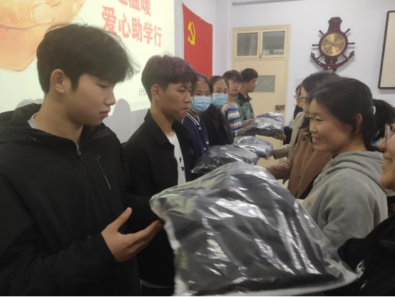 首先,郭桂花讲话,对大家进行了鼓励以及感恩教育。希望同学们在收获帮助的同时能有一颗友爱、感恩、进取的心,将仁爱之心发扬光大;同时,要克服困难、积极进取、全面发展,用自己的实际行动和优异成绩回馈社会、报效祖国、服务人民。紧接着,王珍珍介绍了学校对家庭经济困难学生的各项资助政策,鼓励同学们将当下的困难转化为奋进的动力,通过知识改变命运,励志成长成才、回报社会。随后,各班受助学生代表上前领取资助物品,学院领导和辅导员老师将羽绒马甲亲手送到学生手中,并予以慰问,代表了学院对学生们生活、学习各方面的关心、支持和期望。最后,学院领导、辅导员老师和学生代表一起合影留念。