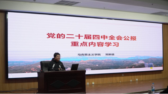 学习会特邀马克思主义学院教师常新语作专题辅导报告,系统解读党的二十届四中全会公报重点内容。报告从充分认识全会的重大意义、深刻领会全会关于“十五五”时期的新思想新论断、牢牢把握高质量发展等方面进行了系统阐释,强调了“十五五”时期在基本实现社会主义现代化进程中的重要地位,并结合我省、我校实际情况引导师生思考如何将全会精神落实到推动地方与学校发展的具体行动中。